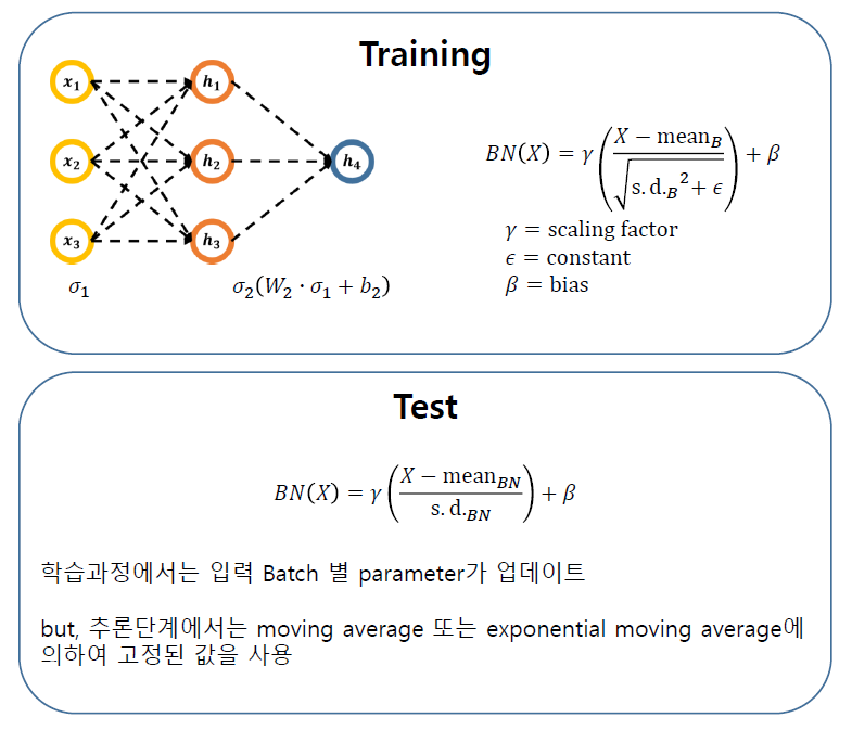 학습 과정에서 각 batch별 입력값을 평균 = 0, 표준편차 = 1로 정규화한다. meanB는 미니 배치 B에 대한 데이터 xi의 평균, s.d.B^2는 분산, 은 분모가 0이 되는 것을 방지하기 위한 작은 값이다. 정규화된 값에 학습 가능한 매개변수 감마(scaling factor)와 베타(bias)를 적용하는데, 이 두 파라미터는 원래의 입력값 분포를 복원할 수 있도록 한다. 한편, 추론 단계에서는 학습 동안 추적된 이동 평균과 이동 분산을 사용하여 정규화한다. 이는 각 미니 배치에서 계산된 통계값의 평균을 추적하여 얻은 값으로 이 과정을 통해 테스트 시 입력 데이터에 대해 일관된 정규화를 제공한다.