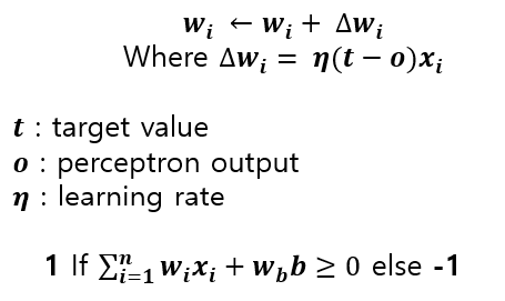 퍼셉트론은 뉴런이 다른 뉴런으로부터 신호를 입력받듯 다수의 값 𝑥을 입력받고, 입력된 값마다 가중치(𝑤𝑒𝑖𝑔ℎ𝑡)를 곱한다. 여기서 가중치는 생물학 뉴런에서 뉴런 간 시냅스를 통한 결합의 세기와 같은 역할을 하며, 가중치가 클수록 입력값이 중요하다는 것을 의미합니다. 입력값으로써 𝑥 외에도 편향(bias, 𝑏)은 딥러닝 모델 최적화의 중요 변수 중 하나이다. 일반적으로 입력값을 1로 고정하고 편향 𝑏를 곱한 변수로 표현한다. 입력값과 가중치의 곱, 편향은 퍼셉트론으로 전달됩니다. 퍼셉트론은 입력받은 값을 모두 합산하는데, 합산된 결괏값을 가중합이라 부른다. 생물학적 뉴런은 신경세포체에 저장한 신호의 크기가 임계값(𝜃)보다 클 때 신호를 출력한다고 했다. 퍼셉트론에서도 가중합의 크기를 임계값(𝜃)과 비교하는 활성화 함수를 거쳐 최종 출력값을 결정한다. Δwi = η(t−o)xi 즉, 입력값이 클수록 예측치와 실제값의 차이가 클수록 학습률이 클수록 가중치 변화량이 커진다.